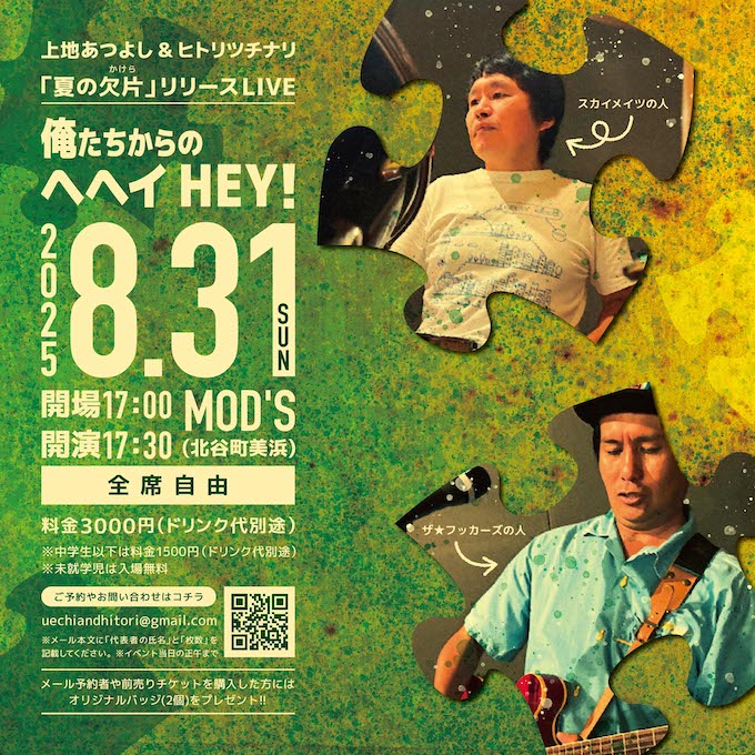 1990年代後半から2000年代の沖縄ストリート・ロックファンにとって嬉しいライブのお知らせです。元スカイメイツの上地あつよしと元ザ☆フッカーズのヒトリツチナリのふたりのユニット「上地あつよしとヒトリツチナリ」のファースト・シングル「夏の欠片-かけら」リリース記念ライブ『上地あつよしとヒトリツチナリ LIVE 〜俺 俺たちからのへヘイHEY!〜』が2025年8月31日(日)、LIVEHOUSE MOD’Sにて開催。個性の違うふたりならではの自由で楽しい音楽をめざし、ユニットを結成して15年、まさにふたりのおじさんアーティストの真夏のノリノリ・コールアンドレスポンス劇場になりそう。2025年8月31日(日)は、LIVEHOUSE MOD’Sへ!!
