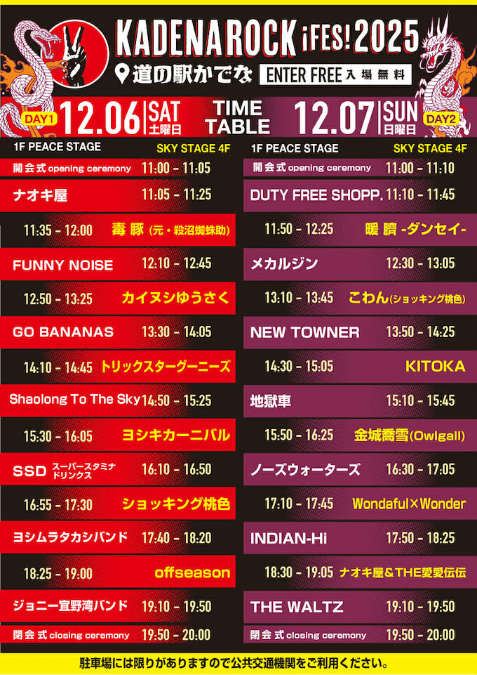 いよいよ2025年12月6日(土)〜7日(日)に開催が迫ってきた、沖縄ストリートロックシーンの歴史が蘇る! 道の駅かでな「カデナロックフェスティバル2025」のタイムテーブルが発表されました。画像を保存して12月6日(土)〜7日(日)は、道の駅かでな「カデナロックフェスティバル2025」へGO!!