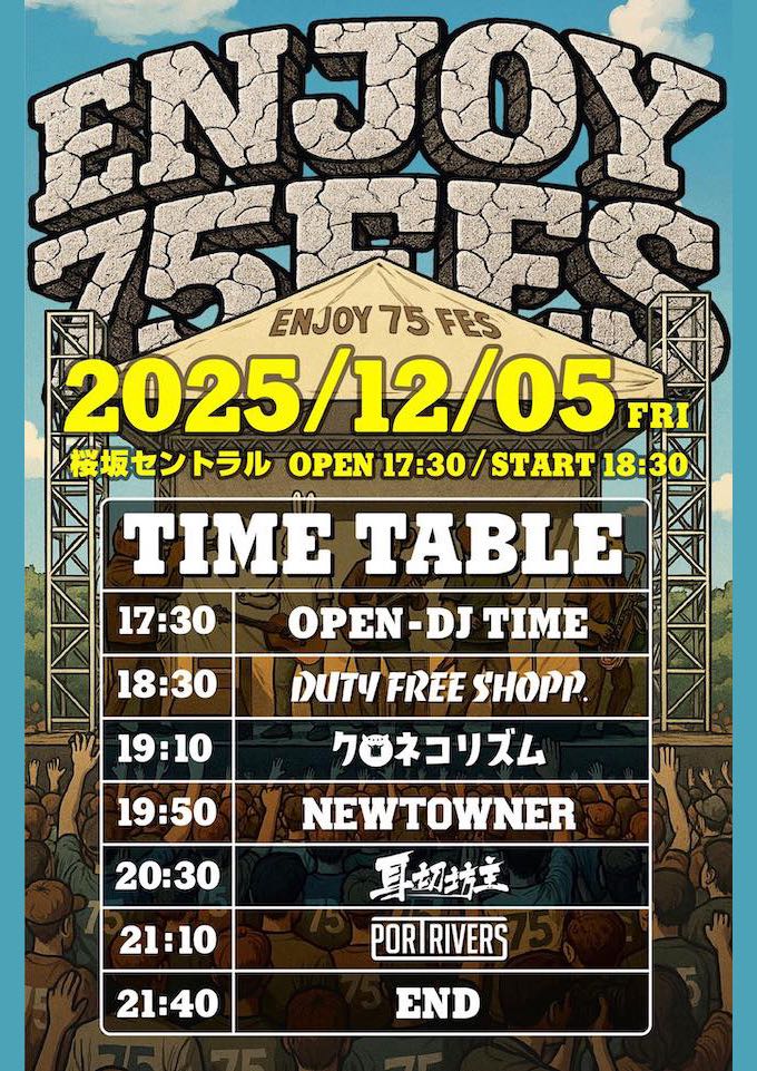 2025年12月5日(金)、桜坂セントラルにて開催される、2000年代沖縄ストリートロックシーンを席巻したバンド大集合のライブイベント「Enjoy75 Fes」のタイムテーブルが発表されました。画像を保存してライブへGO!