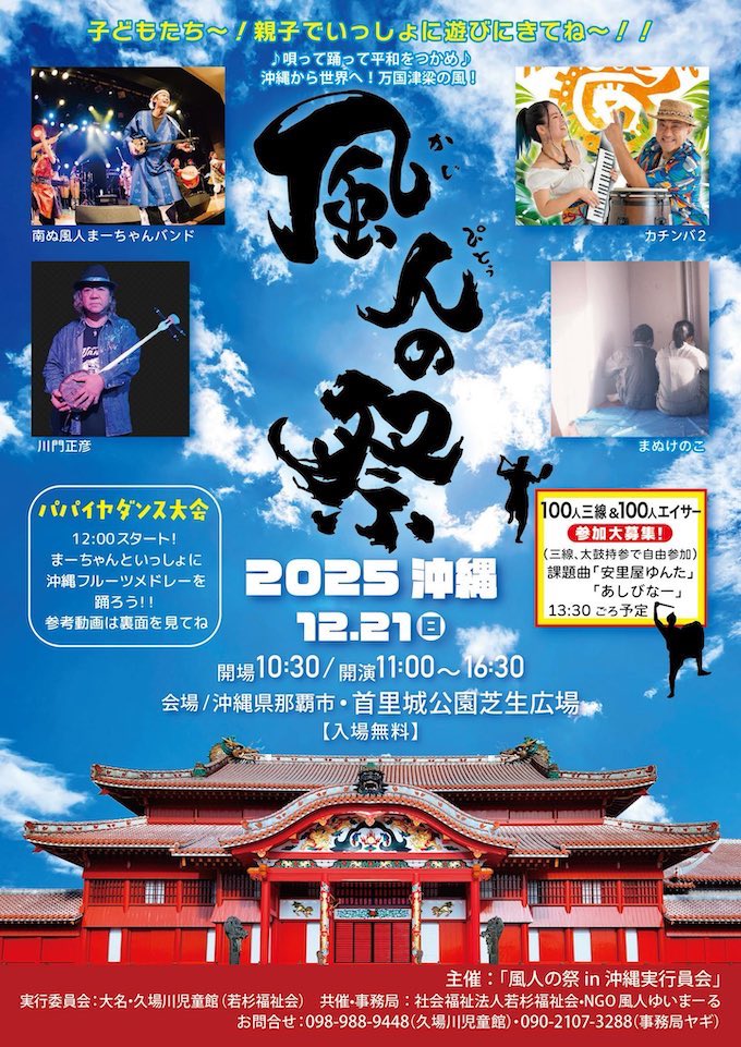西表島の三線アーティスト、南ぬ風人まーちゃんうーぽーが全国で開催している 唄と踊りで平和を届けるお祭り「風人の祭」が2025年12月21日(日)、沖縄県那覇市首里城公園芝生広場にて開催! 出演は、南ぬ風人まーちゃんバンド、川門正彦、カチンバ、まぬけのこ、ほか。このイベントは見るだけでなく参加するお祭りです。「100人三線×100人エイサー」のメンバーも募集中。三線とパーランクー持参でご参加ください。また、「みんなで踊ろうパパイヤ大会」も実施。詳細は、以下の参考動画をご覧ください。親子で楽しめる楽しい音楽祭、ぜひご参加ください。
