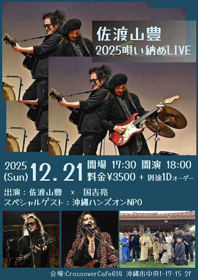 「佐渡山豊 2025唄い納めLIVE」がコザ(沖縄県沖縄市)のライブハウスCrossoveer Cafe 614にて明日、12月21日(日)に開催される。出演は、佐渡山豊、今年待望のソロアルバムをリリースしたギタリストの国吉亮、そしてスペシャルゲストには沖縄ハンズオンNPO。戦後80年の節目の年の締めくくり、佐渡山豊の魂のメッセージ、全身で受け止めてください。