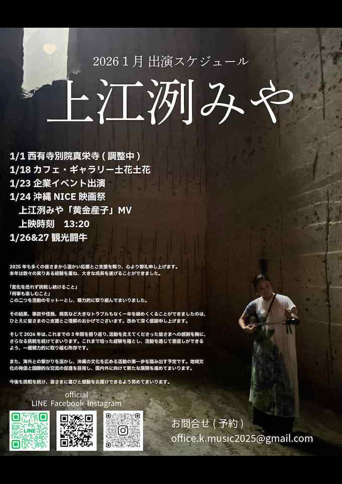 2025年5月23日にファースト・アルバムCD『浜下り』をリリースした、沖縄県うるま市出身の唄者上江洌みやの「浜下りツアー」。台湾、東京、名古屋、オーストラリアなどの公演を経て、先日関東ツアーを大成功に収め2025年を駆け抜けました。その上江洌みやから、沖縄LOVEwebの読者のみなさんに、年末の挨拶が届きました。2026年も大きな飛躍が期待される唄者 上江洌みやの応援、よろしくお願いします。