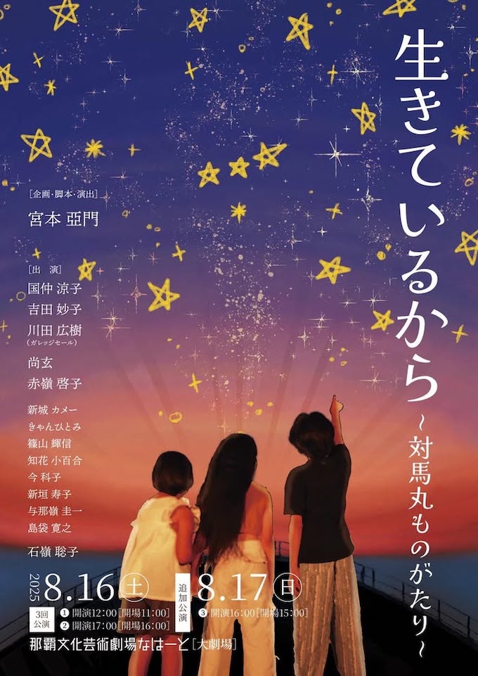 戦後80年祈念 舞台『生きているから~対馬丸ものがたり~』が2025年8月16日(土)、17日(日)、那覇文化芸術劇場なはーと大劇場にて開催。宮本亞門による企画・脚本・演出の本作は、1944年に太平洋戦争末期の沖縄で起きた「対馬丸事件」を題材に、命の尊さと戦争の悲惨さを描いた作品。主人公・啓子は疎開船対馬丸の撃沈を生き延び、絶望の中でも「生きて帰る」との母との約束を胸に希望をつなぐ。帰郷後も苦難が続くなか、彼女は命の尊さを伝える使命を感じ、生き続ける。出演者と子どもたちが「生きているだけで素晴らしい」と、命への賛歌を歌い上げるフィナーレは必見。出演は、国仲涼子、吉田妙子、新城カメー、尚玄、川田広樹(ガレッジセール)、篠山輝借、きゃんひとみ、新垣寿子ほか。楽曲提供は、島袋 優(BEGIN)、音楽は、辺土名 直子、松元 靖、宮良 和明、Chris、細川 拓実らが担当し、スペシャルゲストに石嶺聡子を迎える。豪華製作陣による戦後80年祈念 舞台『生きているから~対馬丸ものがたり~』、ぜひご家族でご覧ください。「命どぅ宝」、この思いを未来に繋いでいきましょう。