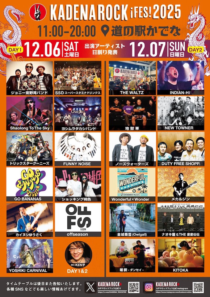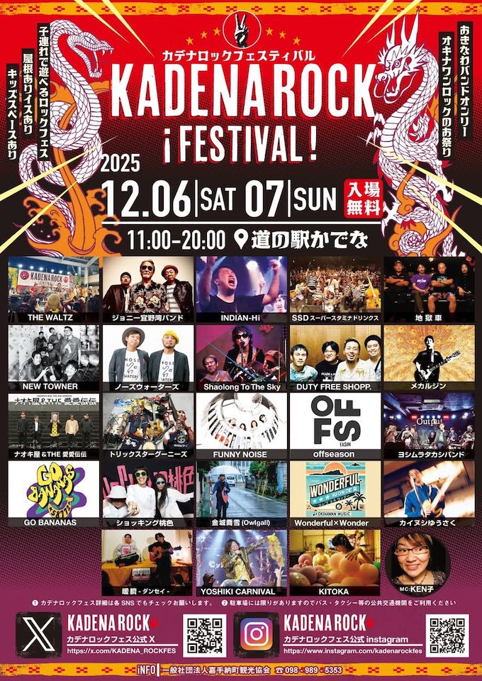 昨年2024年に開催され大好評を博した、道の駅かでな「カデナロックフェスティバル」が今年は昨年よりバージョンアップして2025年12月6日(土)〜7日(日)、「道の駅かでな」にて2DAYS開催!! 出演は、ストリートロックバンドの兄貴、ジョニー宜野湾バンド、THE WALTZ、沖縄インディーズシーンの礎を築いた、地獄車、INDIAN-Hi、DUTYFREESHOPP. 、NEW TOWNER、ノーズウォーターズ 、Shaolong To The Sky、トリックスターグーニーズ、SSD(スーパースタミナドリンクス)、メカルジン、ナオキ屋&THE 愛愛伝伝 などなど出演バンドリストを見るだけでも血沸き肉踊ります! MCを担当するのはKEN子。 屋根あり・イスあり・休憩所・授乳室に美味しい食事と音楽!! ファミリーで楽しめるロックフェスです。1980年代からの沖縄ストリートロックシーンの歴史が蘇る、沖縄バンドオンリーのオキナワンロックの祭典「カデナロックフェスティバル2025」、2025年12月6日(土)〜7日(日)は、道の駅かでなに集合です!!