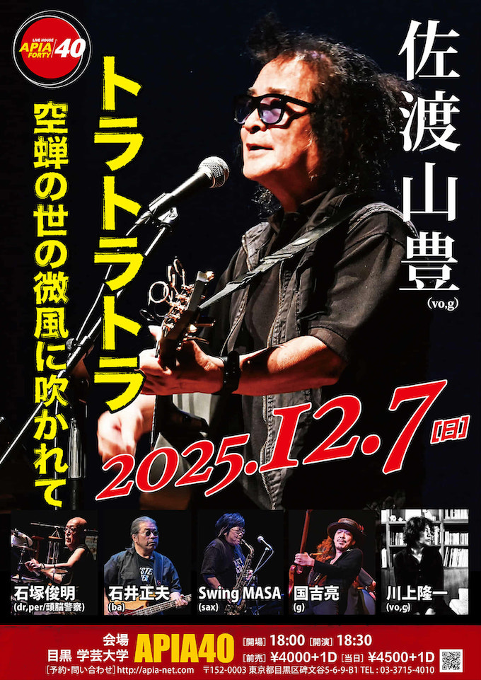 今回は、「空蝉の世の微風に吹かれて」がテーマ。戦後80年の節目の年ではあるが、世界を見渡せば争いが絶えない。威勢のいい言葉が飛び交い、自己顕示を強める首長たち。「魂の抜け殻なってはいないか? ナンセンスな同調圧力に流されてはいないか?」今年のテーマ、タイトルから、そんな佐渡山の問いかけが聞こえてくる。出演は、佐渡山豊、石塚俊明(Dr)、石井正夫(B)、Swing Masa(Sax)、国吉亮(G)、オープンアクトに川上隆一!! こんな時代だからこそ、佐渡山豊の歌が必要なんだ! 12月7日(日)は、アピア40(東京)でしっかりと佐渡山豊の音魂を受け取ってください!