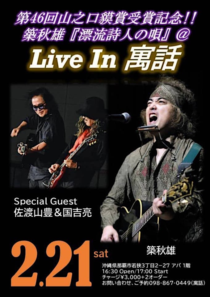 2025年7月、沖縄を代表する詩人、山之口貘(1903~63年)の文学を受け継ぐ詩作品や詩作活動を表彰する第46回山之口貘賞の選考会が行われ、奄美市出身のシンガー・ソングライター築秋雄(ちくあきお)の詩集『漂流詩人の唄』が受賞作に選ばれました。その受賞を記念したライブ「第46回山之口貘賞受賞記念!! 築秋雄『漂流詩人の唄』@Live In 寓話」が2026年2月21日(土)、Live In 寓話にて開催。スペシャル・ゲストとして山之口貘の詩を歌った楽曲「弾を浴びた島」、「紙の上」などの名曲を生み出し、自身のアルバムでも発表している魂のシンガー・ソングライター佐渡山豊とギタリストの国吉亮の出演も決定しました!! 世界の均衡が崩れ始めている今だからこそ体感したいライブです! 2月21日(土)は、JAZZ LIVE IN 寓話へ!!