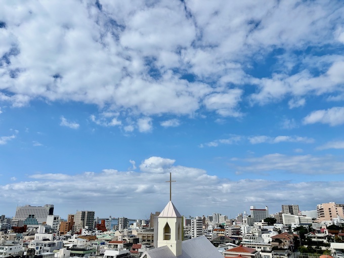 雲の隙間からピンポイントでチャペルに陽が射した瞬間をスナップした今日の沖縄の空、寒さも一段落して、ポカポカ陽気な月曜日の昼下がりです。