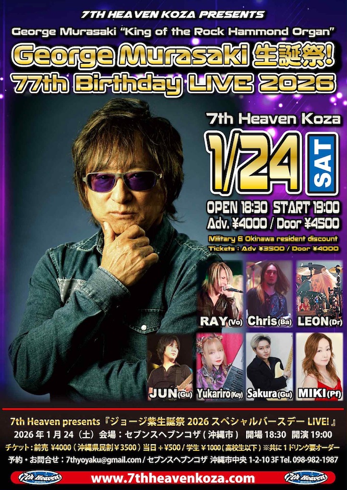 オキナワンロックレジェンド・バンド「紫」のリーダー、ジョージ紫の77歳を祝う生誕祭スペシャルライブ「George Murasaki (ジョージ紫)生誕祭「77」」が2026年1月24日(土)、7th Heaven Kozaで開催! 出演は、ジョージ紫(Key)、Chris(B)、LEON(Dr)、JUN(G)、RAY(Vo)、Yukari(Key)、桜花(G)ほか。2026年1月24日(土)は、ロックレジェンド、ジョージ紫の77歳のバースデイを盛大にお祝いしましょう!!