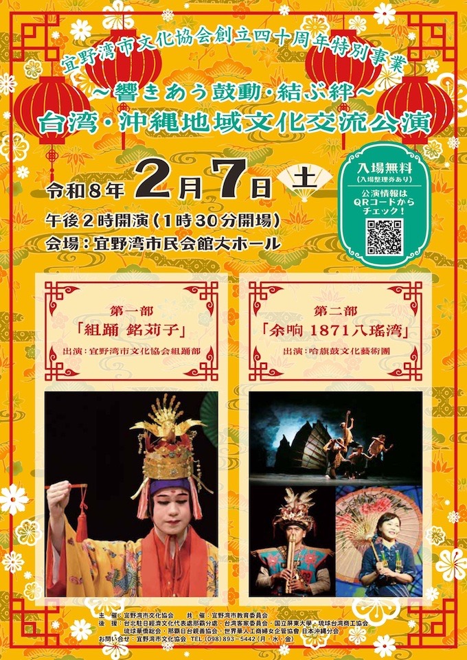 台湾と沖縄の地域文化交流をテーマとした特別公演、宜野湾市文化協会創立40周年記念事業「〜響きあう鼓動・結ぶ絆〜 台湾・沖縄 地域文化交流公演」が2026年2月7日(土)、宜野湾市民会館 大ホールにて開催されます。