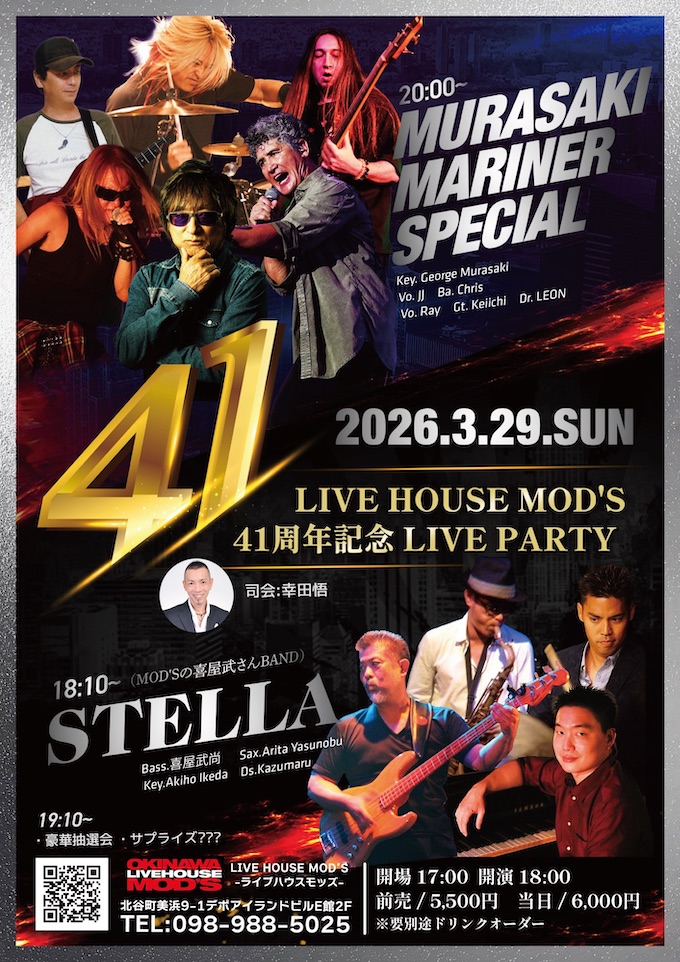沖縄のライブハウスの老舗、ライブハウスモッズの41周年記念ライブパーティーが2026年3月29日(日)、ライブハウスモッズにて開催!! 出演は、オーナーの喜屋武さんがベースを担当するインストゥルメンタル・バンドSTELLA(喜屋武尚、Arita Yasinobu、Akiho Ikeda、Kazumaru)、そしてそして昨年の周年祭でも最高なロックを響かせてくれたMURASAKI MARINER SPECIAL(George Murasaki、JJ、Chris、Ray、Keiichi、Leon)! 筆者的にはこのときのMURASAKI MARINER SPECIALのライブ・パフォーマンスが2025年ベスト・オキナワンロック・サウンドでした。司会は毎度おなじみ、わたくし沖縄カルチャーの広告塔 幸田悟が担当。詳細&最新情報はライブハウスモッズ公式サイトでご確認ください。2026年3月29日(日)は、ライブハウスモッズで41周年のお祝いをみんなで盛り上げましょう!!