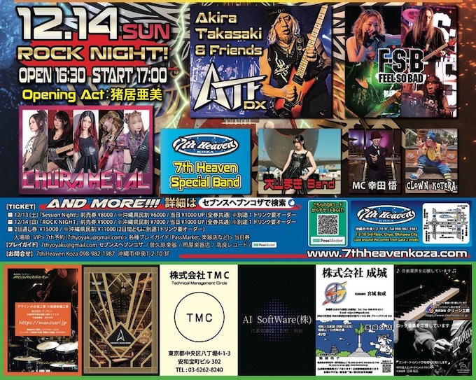 オキナワンロックの聖地、7th Heaven Kozaの25周年を記念したフェス、『7th Heaven Festival 2025』が開催中! 昨日のDay1、スーパーセッションナイトは、出演者総出の大セッション大会で大盛り上がり! そして本日12月14日 (日)のDay2は、日本が世界に誇るATF DX(高崎晃・山下昌良・影山ヒロノブ・LEONほか)、バリバリ最強No.1! 沖縄初生演奏のFEEL SO BAD、さらには、美女揃いのCHURA METALも登場‼️ そして7th Heaven Special Band feat. SYUでは「You’re The Only」の小野正利、「CHA-LA HEAD-CHA-LA」でもおなじみ影山ヒロノブなどが出演。オープニングアクトは猪居亜美(クラシックギター)! 沖縄ROCK史に刻まれるロック・ナイト! 本物のロックを7th Heaven Kozaで体感しよう!!