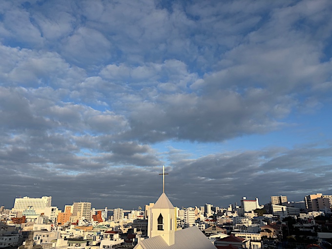ビルの稜線から朝日が顔を出し、那覇の街を明るく照らし始めた午前7時半の西の空、緩やかに吹く北風が心地いい今日の沖縄です。
